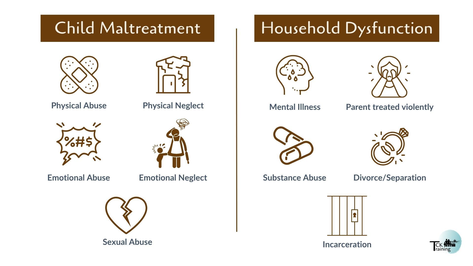 Child maltreatment includes direct action against a child (abuse and neglect). Household dysfunction consists of factors in the child's living environment which contribute longterm risk (such as household adults experiencing mental illness, drug abuse, or incarceration).