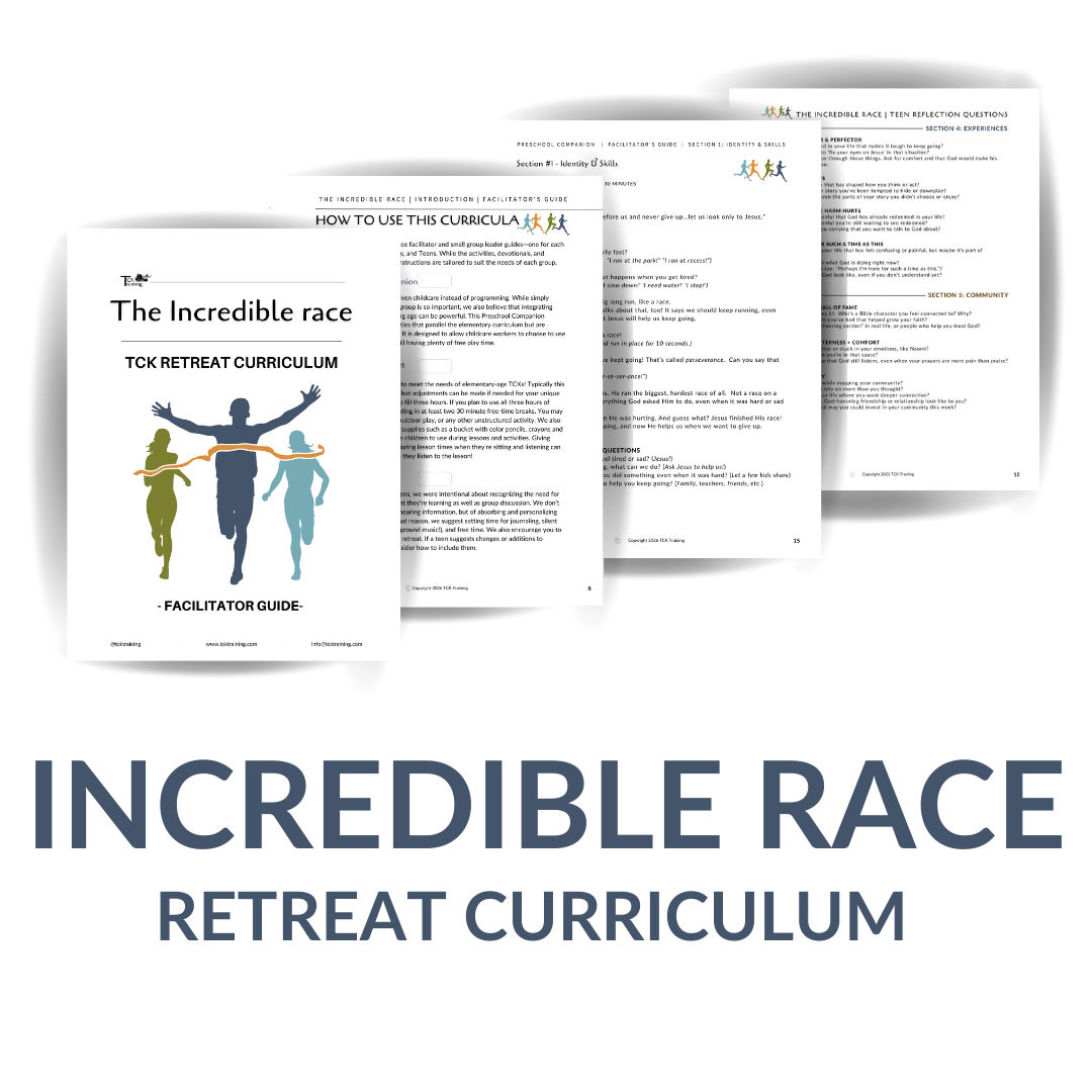 Our Retreat Curriculum is designed to be easy to use for anyone, whether they've worked with TCKs before or this is the first time they've volunteered at a conference! It is 15 hours of faith-based TCK content with thematic lessons, worksheets, T-Shirt designs, stickers, and more.