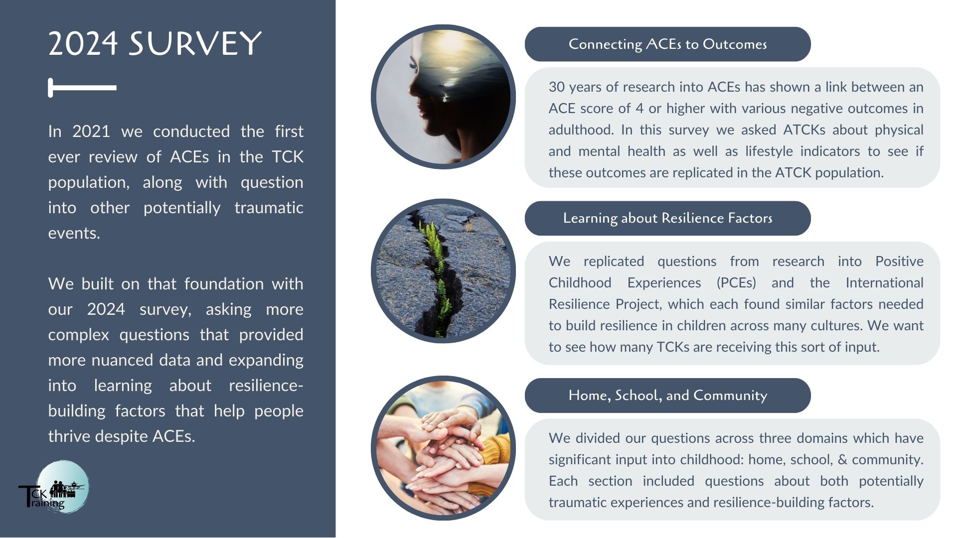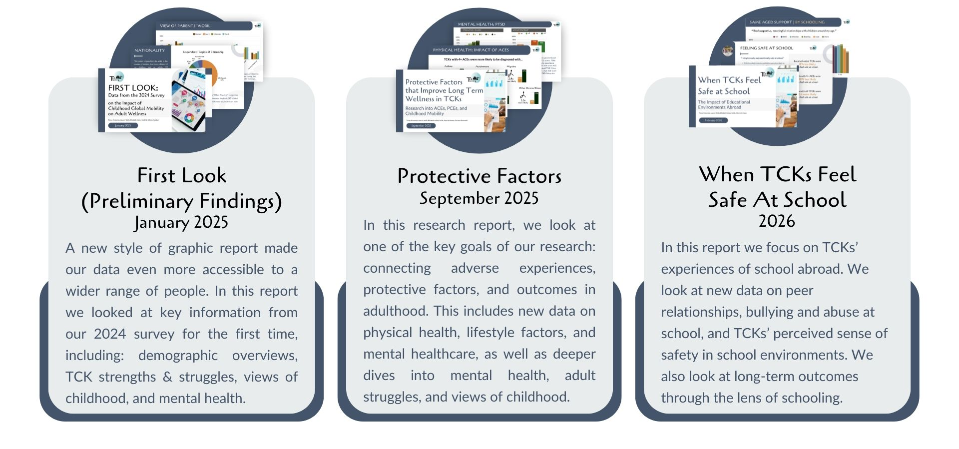 In 2022 we created the position of Research Director and hired Tanya Crossman to fill the position. Tanya has researched TCKs for 10 years and was instrumental in the creation of both our 2021 and 2024 surveys. Since the institution of our Intern program in February 2023, we have also had a Research Intern on our team.